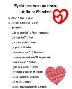 Walentynki w FB w Drążdżewie Opublikowany 15 lutego 2022 przez pbskrasnosielc FILIA BIBLIOTECZNA W DRĄŻDŻEWIE zorganizowała głosowanie wśród czytelników na ulubioną książkę o miłości idealną na Walentynki. Głosować można było w bibliotece od 1 do 14 lutego. Ulubioną książką została „After” Anny Todd.
