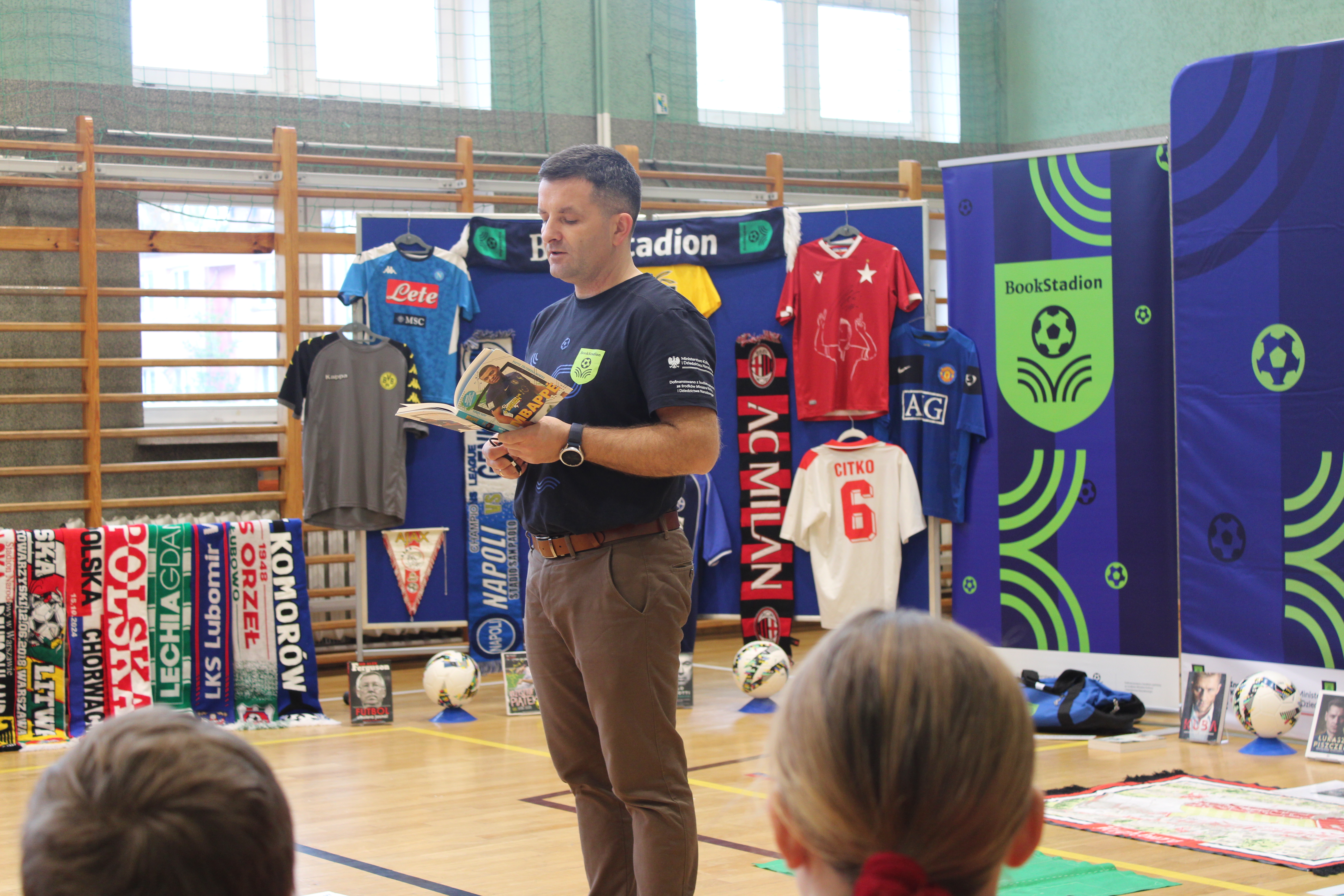 . Prowadzący Paweł Piwowarczyk podzielił się z nimi wiedzą na temat piłki nożnej, przedstawił kilka ciekawych książek o tematyce sportowej, zachęcił do udziału w konkursach.