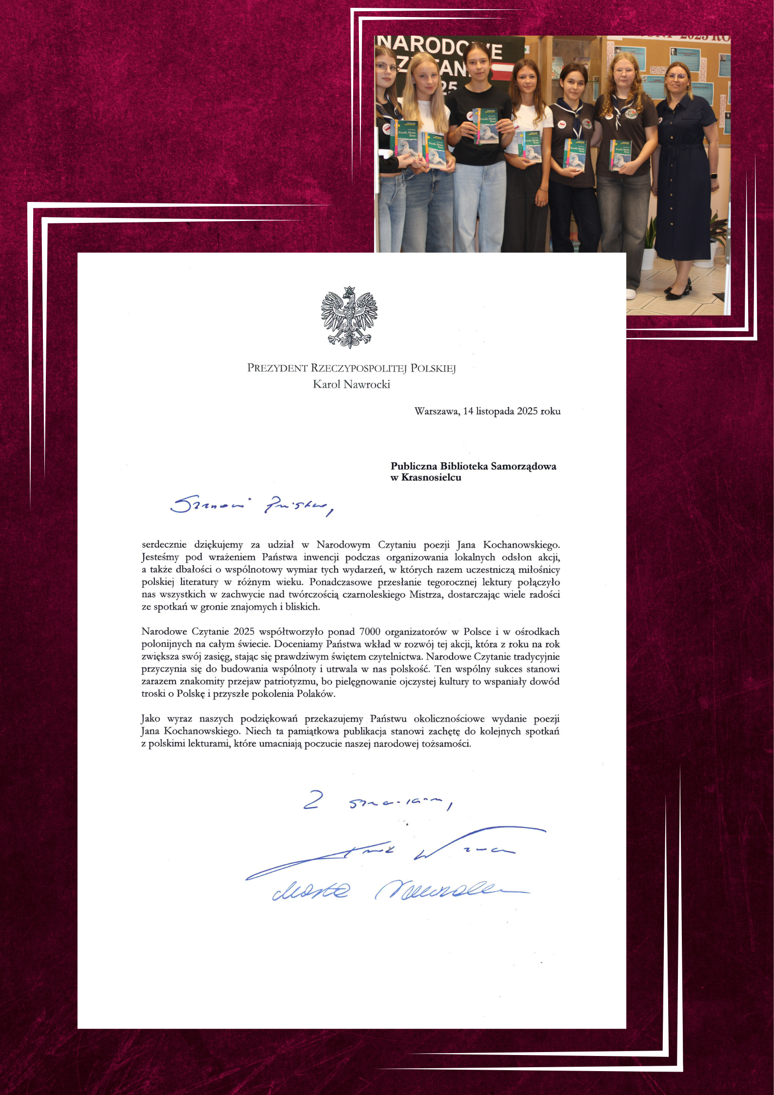 Z przyjemnością informujemy, że nasza Biblioteka po raz kolejny otrzymała oficjalne podziękowanie Dostaliśmy również wyjątkowe wydanie ,,Poezji ” J. Kochanowskiego , które z dumą możemy dołączyć do naszego księgozbioru.