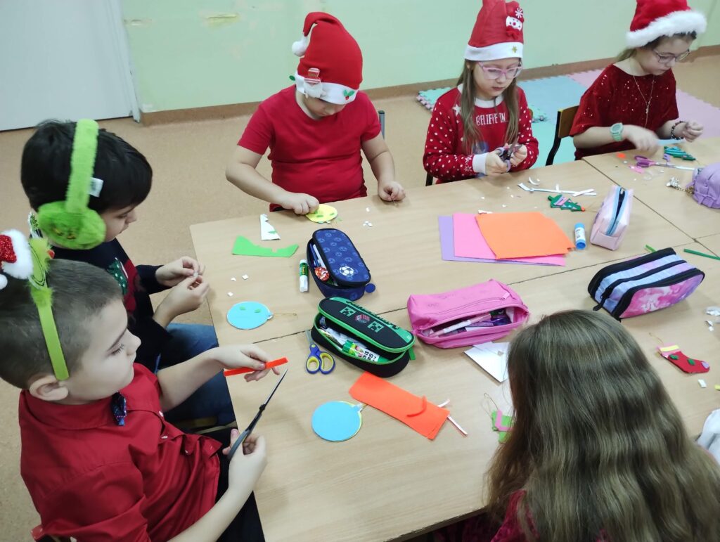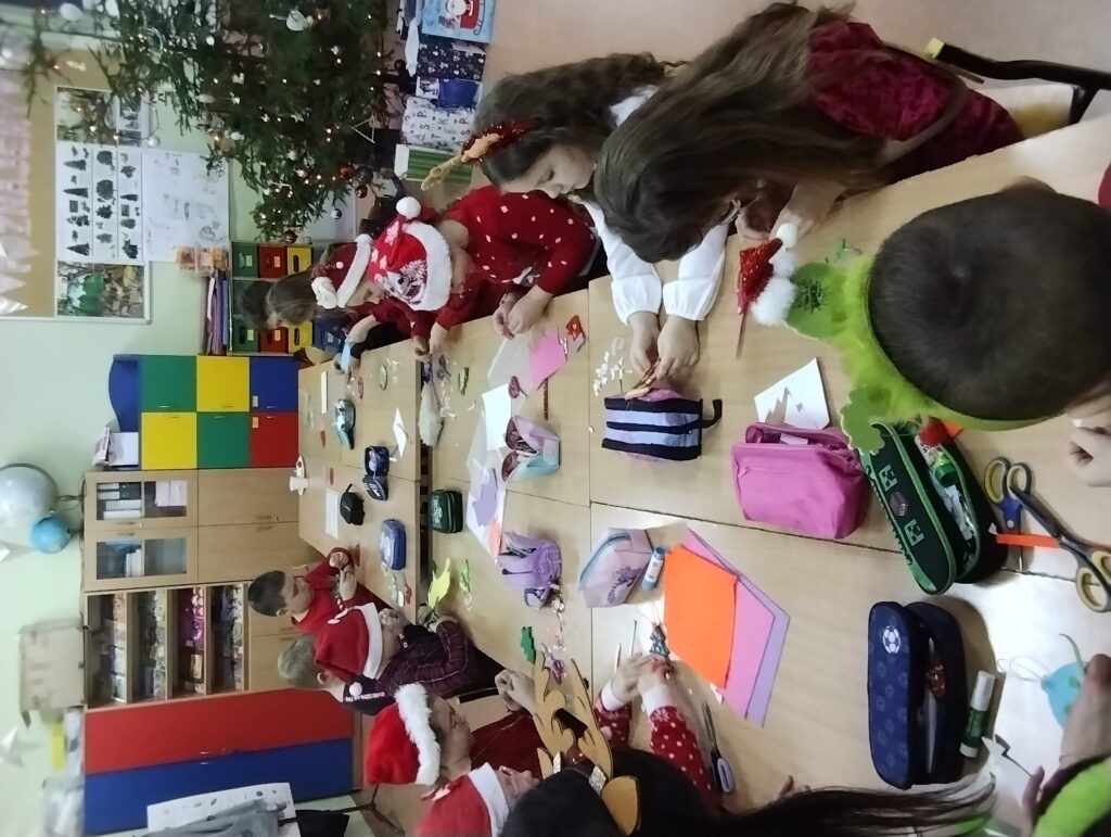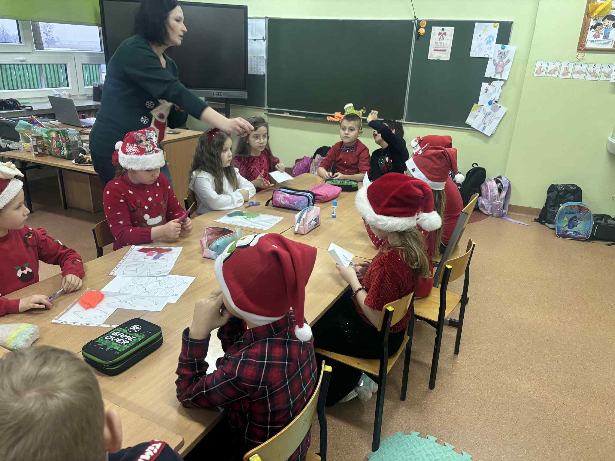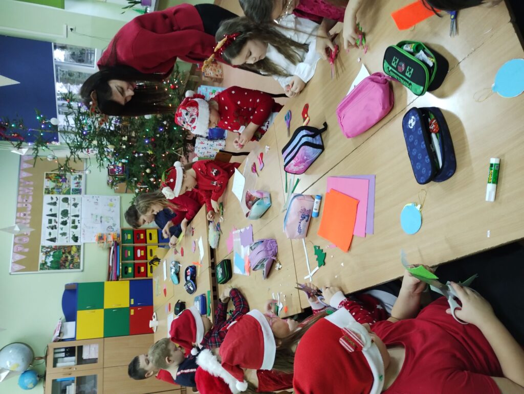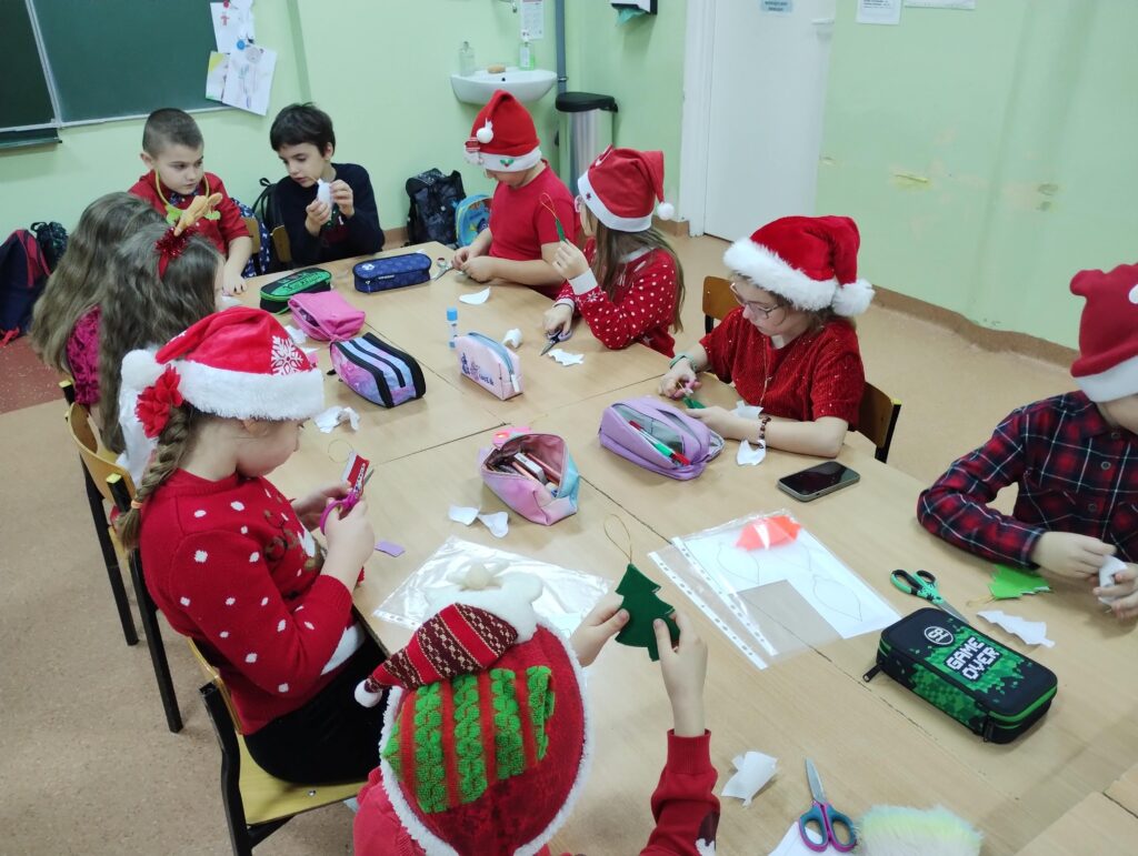 Dzieci podczas warsztatów wykonały piękne bombki z filcu, które zdobić będą choinkę.![]()