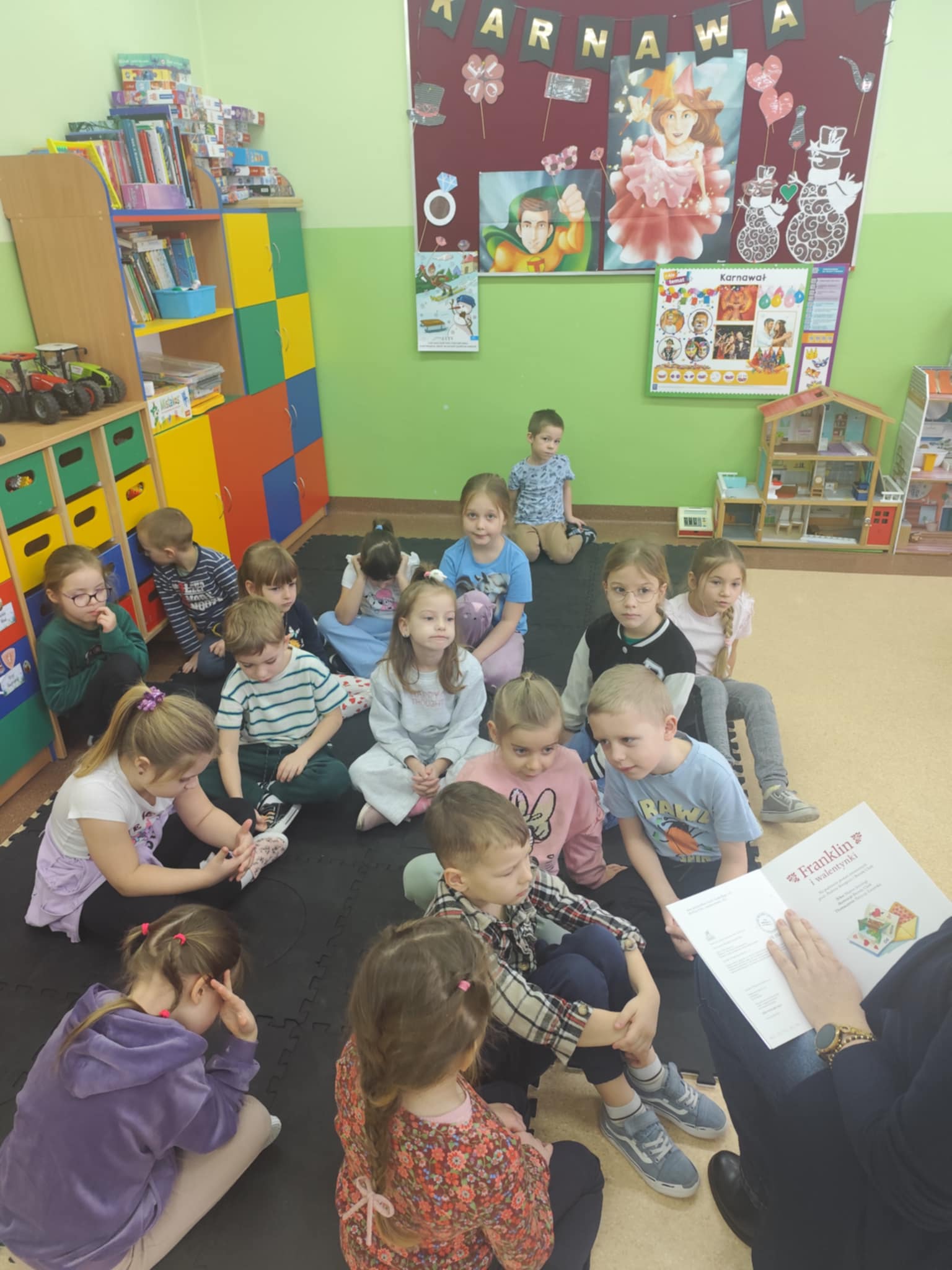 Przedszkolaki wysłuchały bajki „Franklin i walentynki”, o małym żółwiu, który w drodze do szkoły, zgubił kartki walentynkowe dla swoich przyjaciół. ![]()